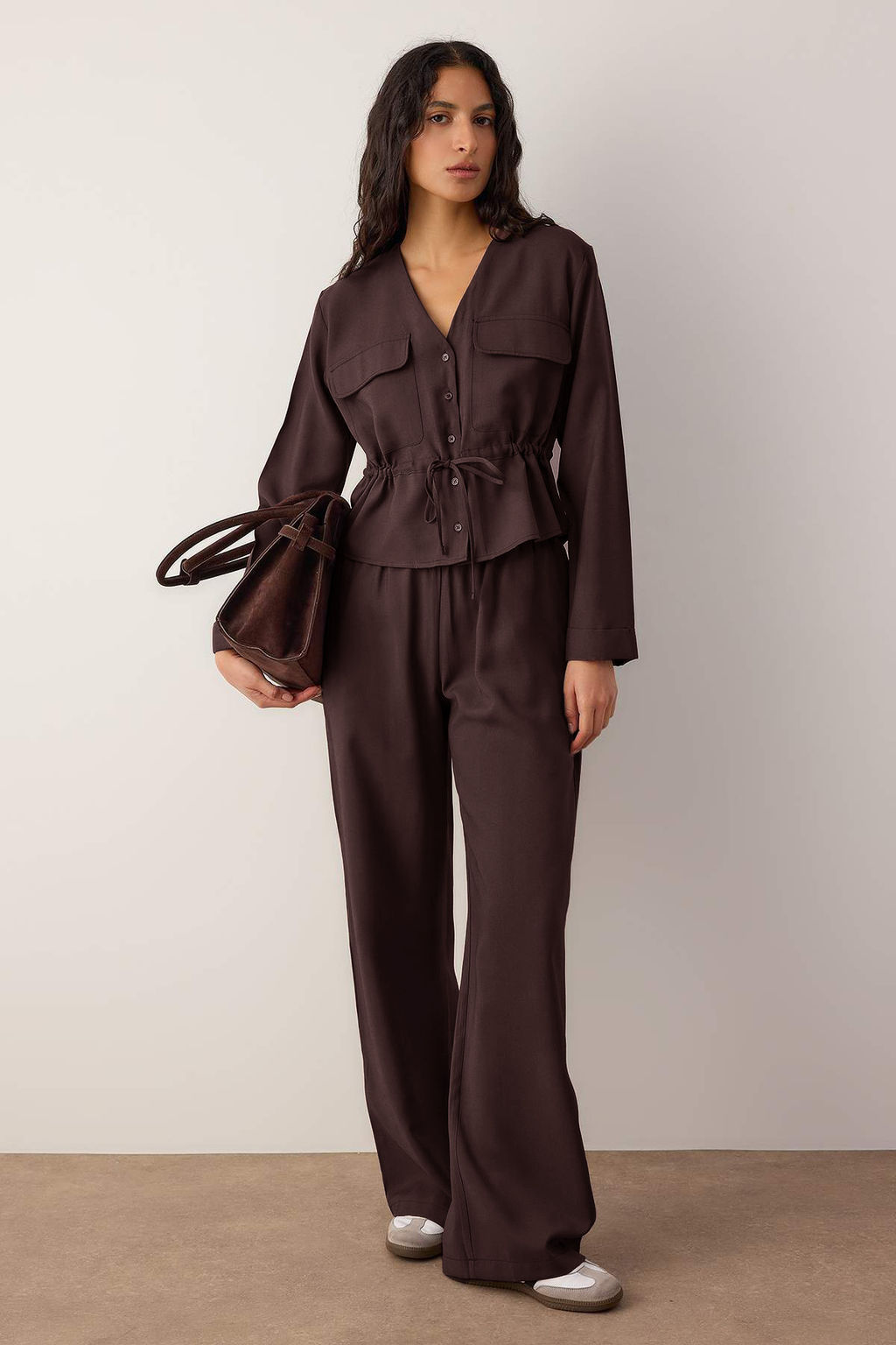 • Koyu Kahverengi Yumusak Dokulu Bluz Pantolon Dokuma Alt - Ust Tak?m TWOAW26AU00111