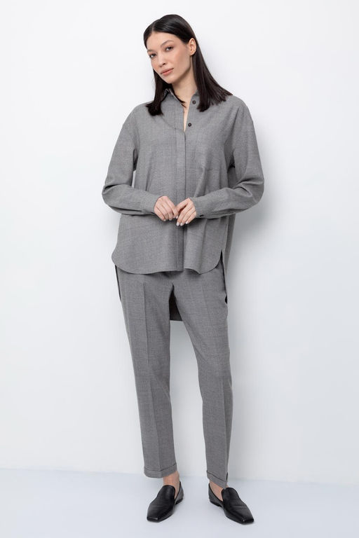 Брюки из мягкой меланжевой ткани с добавлением шерсти прямого силуэта, слегка зауженные книзу, с боковыми карманами, заутюженными стрелками и подворотами. Комфортый пояс на резинке. . Состав: 59% вискоза, 37% шерсть, 2,5% полиамид, 1,5% эластан