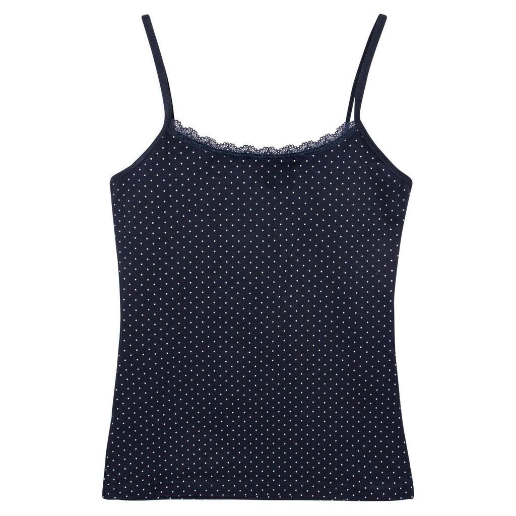 Трикотажная майка на тонких бретелях, декорированная принтом и мягким кружевом.