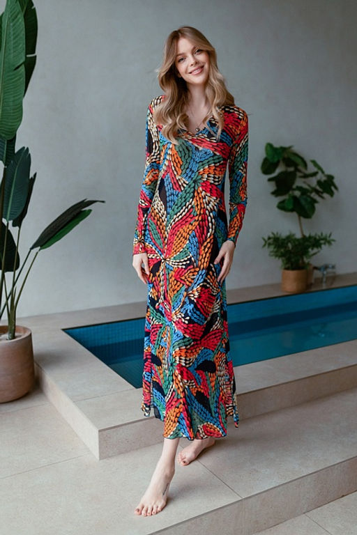 Туника женская выполнена из эластичной сетки с ярким принтом. Модель длиной миди с длинным рукавом. Горловина окантована принтованной сеткой. По подолу разрезы в боковых швах. Срезы рукавов и подола обработаны швом "краевка".­