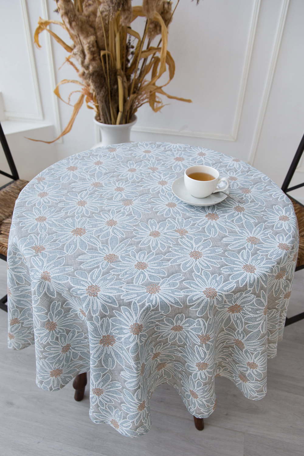Круглая скатерть София диаметром 150см отлично подойдет для классического круглого кухонного стола. Изделие выполнено из высококачественной рогожки плотностью 170 грамм, что позволяет использовать ее ежедневно и часто стирать. Стильные ромашки на сером фоне подойдут под любой интерьер.