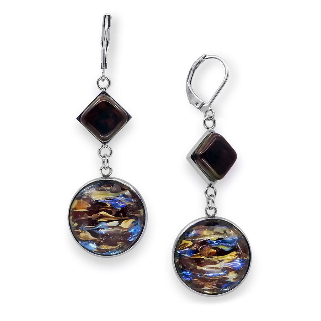 Серьги изготовлены из муранского стекла и гипоаллергенной ювелирной стали, что очень важно для людей с чувствительной кожей. Металл не темнеет и не подвергается воздействиям окружающей среды, надолго обеспечивая красивый внешний вид изделия. Длина серег - 8 см. Диаметр стеклянного элемента - 2 см. Ромб 1,3x1,3 см.  Вес обеих серег - 14 гр.