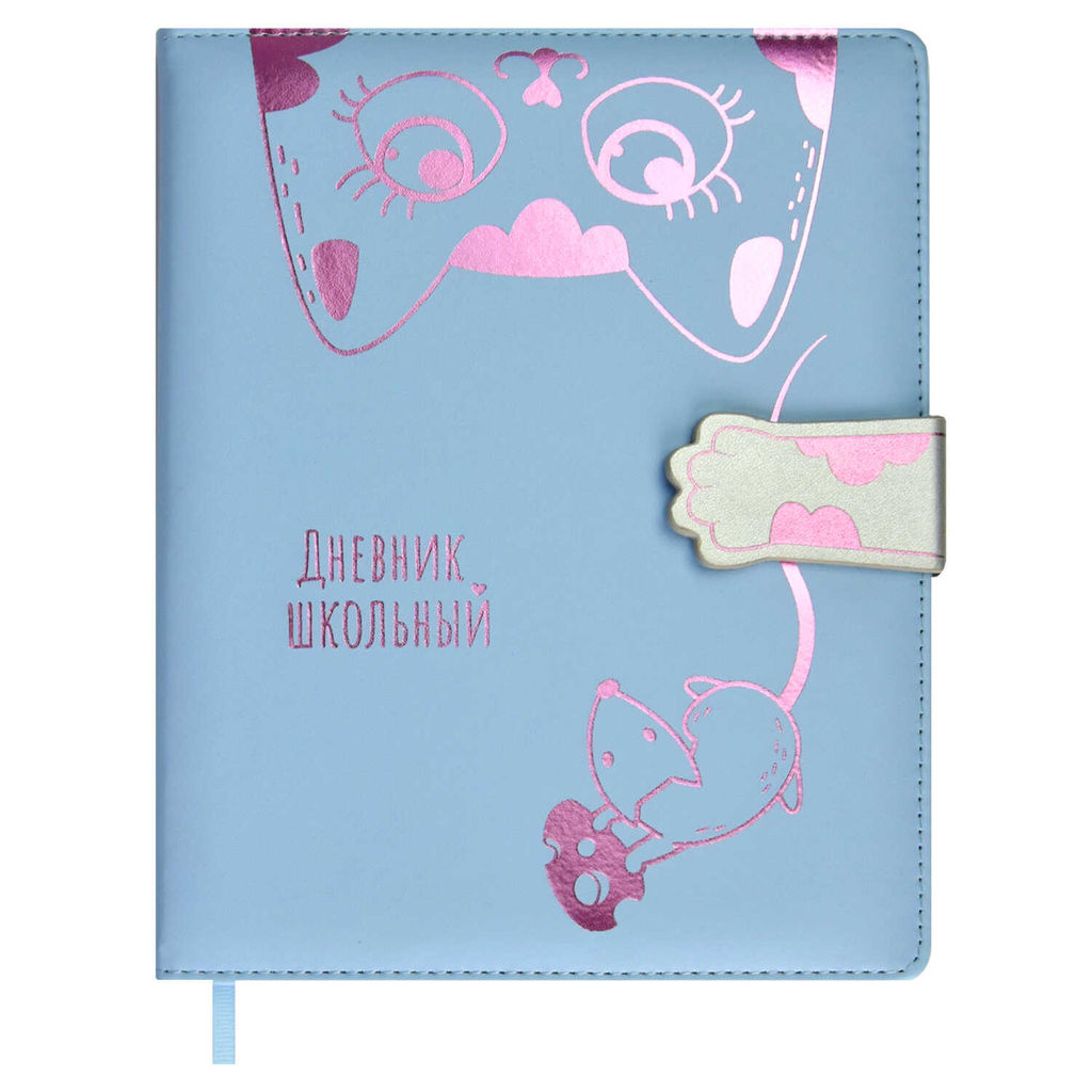 Дневник школьный арт. 62183 / 15 КОТИК С МЫШКОЙ (кожзам: А5+; твёрдый переплёт с поролоном, материал обложки: искусственная кожа "Плонже"; декор: тиснение фольгой (2 цвета); способ крепления блока: ниткошвейный; вн. блок: 48 л., белый офсет 80 г/м?, печать в одну краску, справочный материал: универсальная шпаргалка; отделка среза: окрашивание пантоном; закладка: одно ляссе; форзац: печать в одну краску; особенности: запаянный край, магнитный клапан; индивидуальная упаковка: ПЭТ-пакет)