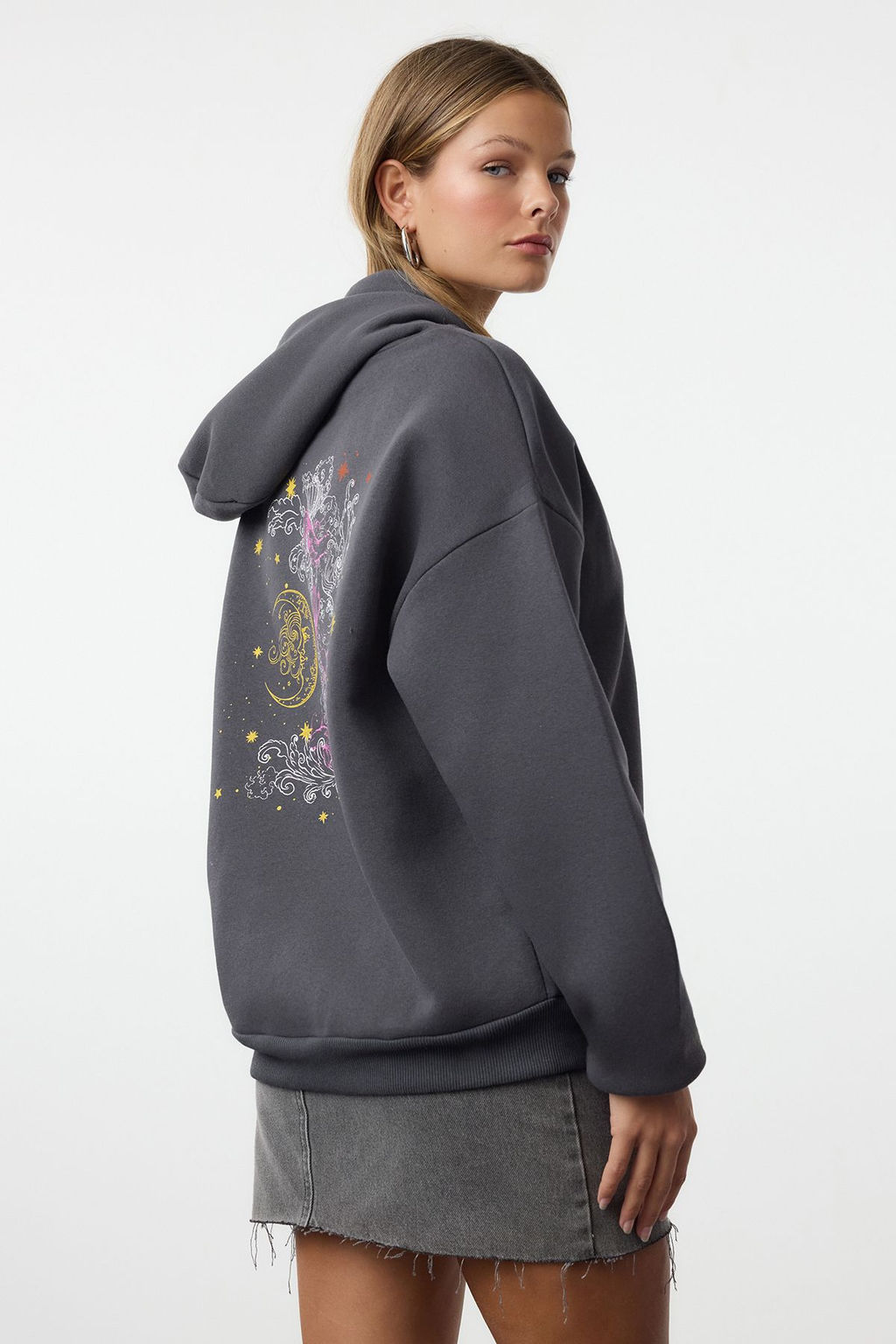 Antrasit Kal?n Ici Polarl? Kapusonlu Bask?l? Oversize/Genis Kal?p Orme Sweatshirt TWOAW24SW00136