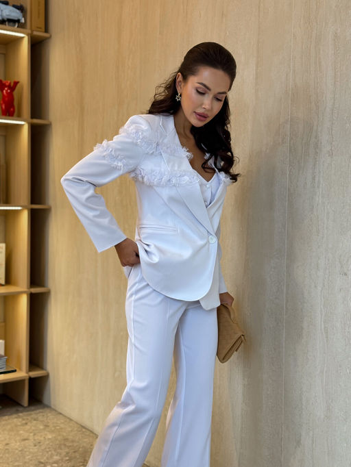 Этот жакет - настоящая жечужина в гардеробе.  Небанальный вариант застёжки сбоку на лицевой стороне, и потайной пуговицей внутри  изделия придаёт жакету характер, подчёркивает силуэт и линию талии. Жакет выгодно акцентирует фигуру, создавая утончённый и женственный образ. Благодаря декоративным рюшам из вуали, он легко станет центральным элементом образа. Карманы с клапанами.­