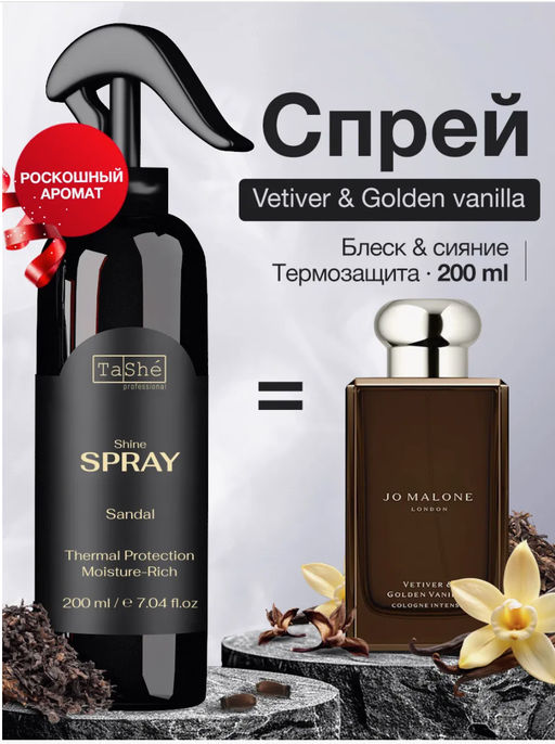 Описание товара Спрей блеск для волос из новой восточной линейки от Tashe, создан специально для ухода за волосами и их защиты от агрессивных внешних факторов, как летом так и в холодную пору года. Восточный аромат создан по мотивам парфюма Jo Malone Vetiver & Golden vanilla и содержит ноты ванили, грепфрута и кардамона, ветивера и сандала. Обеспечивает термозащиту, помогает предотвратить повреждение волос от высоких температур при использовании плойки или фена, создавая невидимый барьер на волосах.