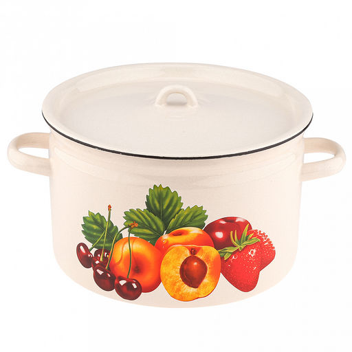 • "Фруктовый сад" Кастрюля эмалированная 7л, форма цилиндрическая, металлическая крышка, металлические ручки, жемчужный (Россия)
