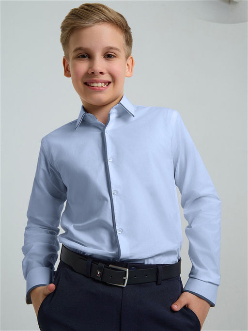 Рубашка изготовлена из хлопка, устойчива к заломам, свободный силуэт на кокетке по спинке, все швы закрытого типа. Детали: свободная посадка, отложной воротник, застёжка на пуговицах, вытачки на спинке, декор: кант т-синий. Манжеты со скошенными краями, имет две пуговицы и шлица по низу рукова. Состав:65% хлопок, 35% полиэстер