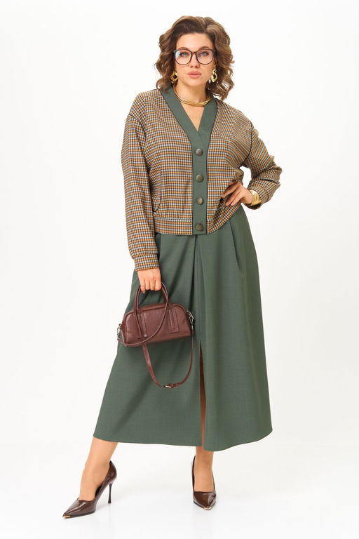Этот костюм воплощение интеллектуальной элегантности. Мягкий светло-серый кардиган с коричневыми кантами и крупными пуговицами создаёт образ уютного шарма. V-образный вырез визуально вытягивает шею, а контрастные детали подчёркивают чёткость линий. Рукав на спущенной плойме с манжетой по низу. По перду накладные карманы с декоративной нашивкой.  Коричневая юбка миди с глубокими встречными складками и разрезом по переду добавляет образу женственности. В боковых швах карманы. Юбка на подкладке.  Для максимально комфортной посадки по бокам пояса вставлена эластичная резинка. Сочетание мягкого верха и строгого низа создаёт баланс между комфортом и аккуратностью, делая комплект универсальным для офиса, повседневных выходов и стильных деловых встреч.­
