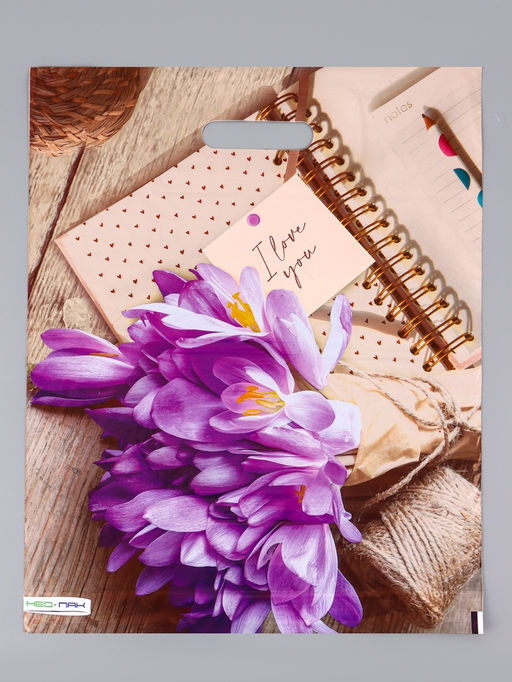 * Сезонный дизайн с цветочной темой: Крокусы как символ ранней весны делают пакет особенно актуальным для подарка на 8 Марта. Неброский бежевый фон и изящный шрифт надписи добавляют утончённости.