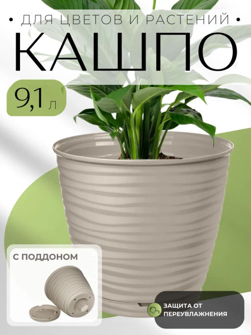 Горшок объёмом 9,1 л оптимален для больших растений и состоит из корпуса и интегрированного поддона, не выступающего за дно горшка. Горшок имеет несколько дренажных отверстий, обеспечивающих качественную вентиляцию корней растений. Каждый поддон снабжён специальной выемкой для слива лишней жидкости, который рекомендуется при уходе за любыми цветами.