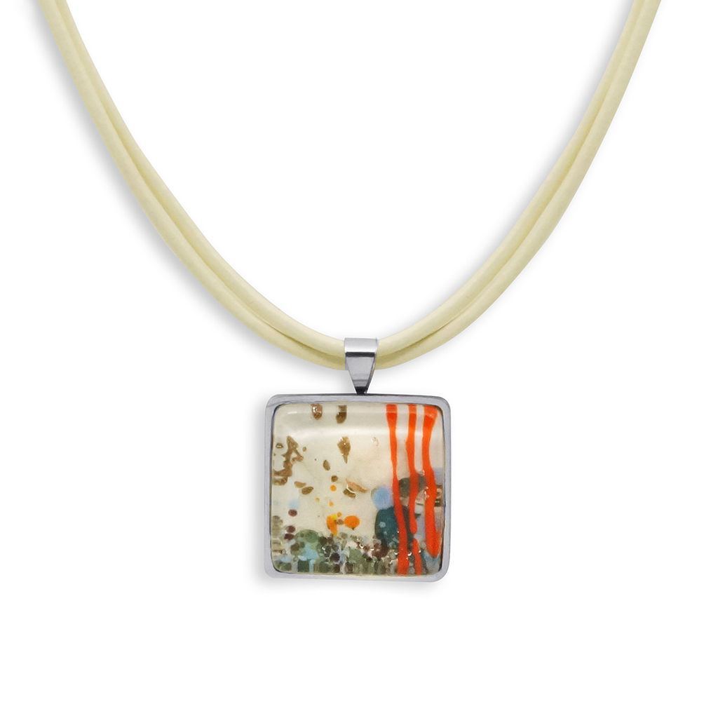 Колье изготовлено из натуральной кожи, муранского стекла и гипоаллергенной ювелирной стали, что очень важно для людей с чувствительной кожей. Металл не темнеет и не подвергается воздействиям окружающей среды, надолго обеспечивая красивый внешний вид изделия. Длина колье - 46 см + 5 см. удлиняющая цепочка. Размер стеклянного элемента - 2,2х2,2 см.  Вес - 16 гр.­