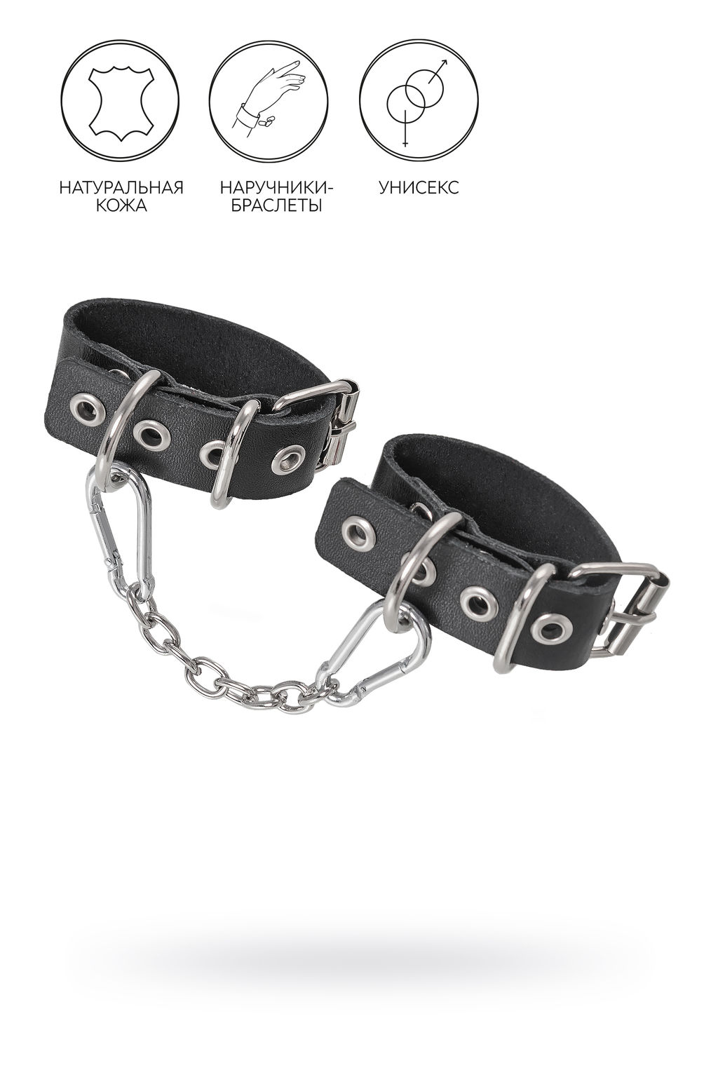 Сексуальный атрибут изготовлен российским производителем. Специальная технология выделки кожи обеспечивает хорошую износостойкость. Черный материал прекрасно прилегает к телу и не оставляет следов. Подходят и мужчинам, и женщинам. Наручники декорированы большими стальными кольцами. Металлическая фурнитура высокого качества обеспечивает надежную фиксацию. Манжеты фиксируются между собой благодаря съемной, короткой цепочке. При желании ее можно заменить на другой необходимый аксессуар.