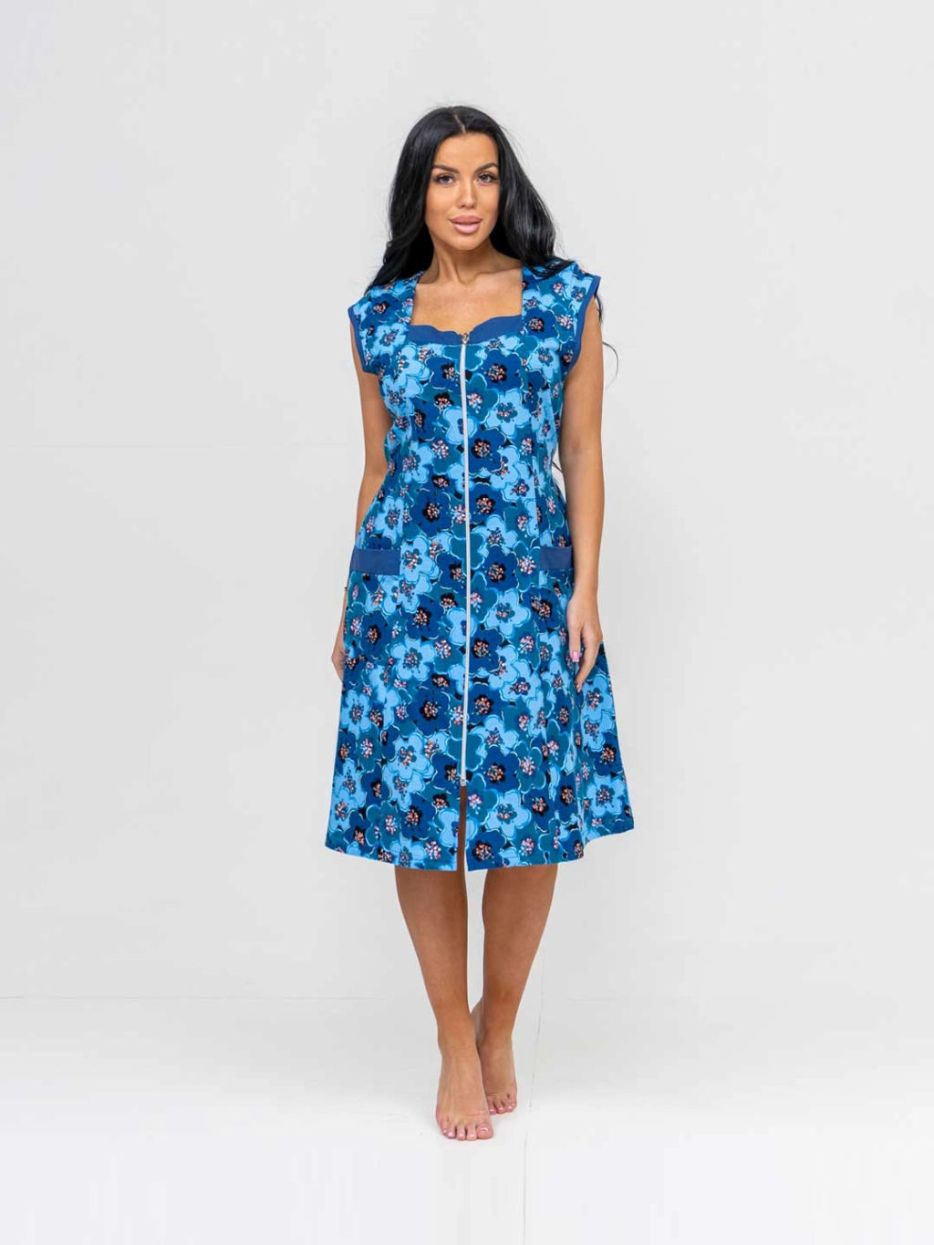 Халат женский полуприлегающего силуэта из комбинированного трикотажного полотна, длинной чуть ниже уровня колена. На полочке прорезные карманы с отделкой в верхней части. Вырез горловины П- образный, с отделкой. Изделие с рукавом - крылышко.­