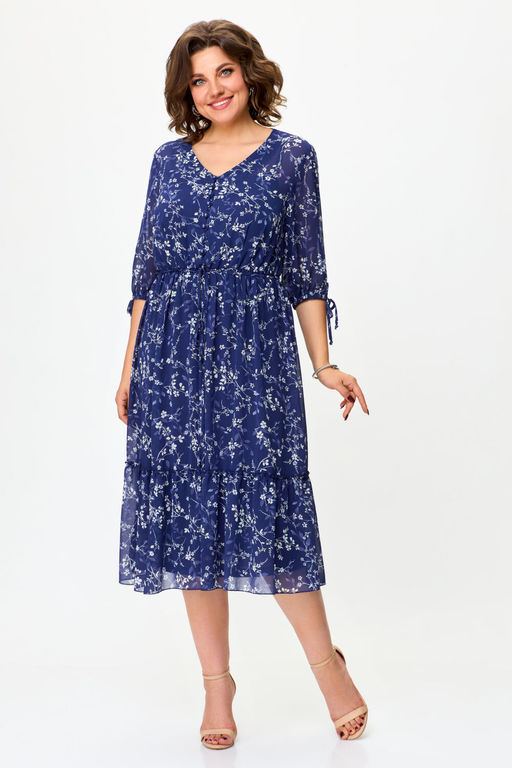 Платье женское полуприлегающего силуэта, расширенное к низу, выполнено в комплектации из двух предметов. Верхнее платье отрезное по линии талии со сборкой на резинке. Застежка на девять воздушных петель и пуговиц.  По низу платья присборенный волан.  Рукав втачной длиной ?, по низу собран на узкую резинку. Нижнее платье -комбинация выполнено из эластичной ткани повторяет силуэт фигуры. Бретели регулируются по длине.