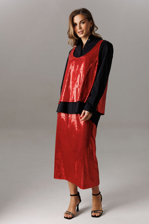 Состав: Рубашка: ПЭ-27%; Хлопок-71%; Эластан-2%; Топ: ПЭ-96%; Эластан-4%; Юбка: ПЭ-96%; Эластан-4%; Блуза рубашечного покроя с втачным одношовным рукавом с манжетой. Спинка изделия состоит из горизонтальной кокетки и основной детали, на которой расположены две складки для свободы движения. Линия низа: фигурная. Рукав втачной, одношовный, с притачной манжетой, высотой 5,5 см и разрезом-планкой для петли/пуговицы. Высота планки- 11 см. Длина рукава в готовом виде 61 см. Горловина оформлена стойкой и рубашечным воротником. Застежка вертикальная на планках петли/пуговицы. Длина блузы по спинке 74-76 см (в зависимости от размерного ряда). Майка выполнена из трикотажного полотна с пайетками свободного прямого силуэта в стиле оверсайз. Спереди и сзади имеет глубокие овальные вырезы и удлиненную линию проймы. Майка съемная. Длина изделия по от плечевого шва по спинке 62 см. Юбка из трикотажного полотна с пайетками, прямого свободного силуэта на трикотажной подкладке. Линия талии оформлена притачным поясом на эластичной тесьме. Длина юбки по среднему шву спинки 79 см. (фурнитура может отличаться от представленной на рекламном фотоматериале) Особые рекомендации: рекомендуется холодная деликатная ручная стирка, без использования отбеливающих СМС, без интенсивного трения. Сушка в вертикальном положении. ВТО с минимальным паром. -- Характеристики -- Состав: Рубашка- ПЭ-27%; Хлопок-71%; Эластан-2%; Топ- ПЭ-96%; Эластан-4%; Юбка- ПЭ-96%; Эластан-4%; Сезон: Осень-Зима Рост: 164 Страна бренда: Беларусь