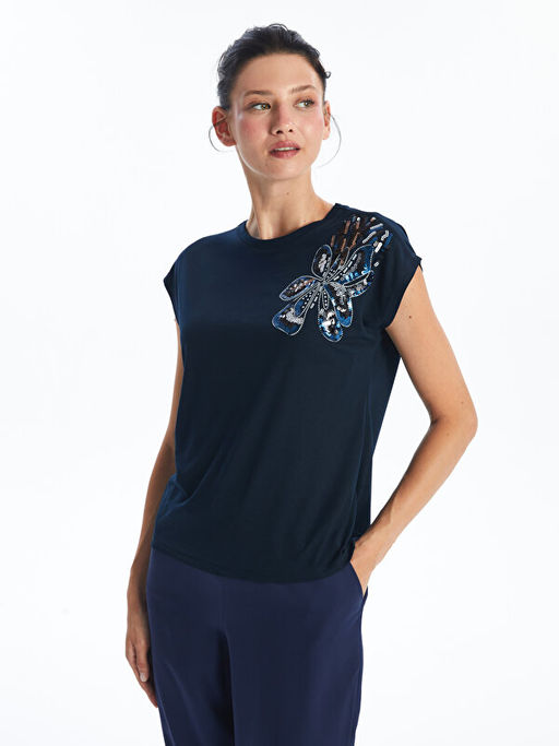 • Bisiklet Yaka ??lemeli K?sa Kollu Kad?n Bluz