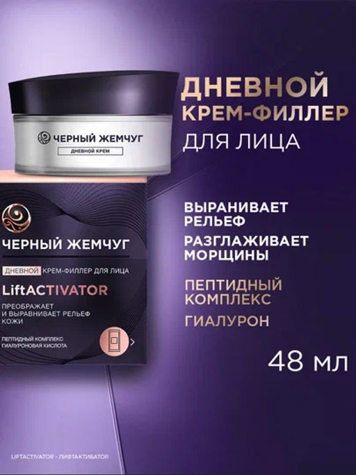 Дневной крем-филлер для лица Черный Жемчуг LiftACTIVATOR - ЛифтАКТИВАТОР создан специально для кожи от 35 лет. Он преображает и выравнивает рельеф кожи и борется с первыми признаками ее увядания. Омолаживающий крем с пептидным комплексом повышает упругость кожи, подтягивает контуры лица и предотвращает появление возрастных пигментных пятен.