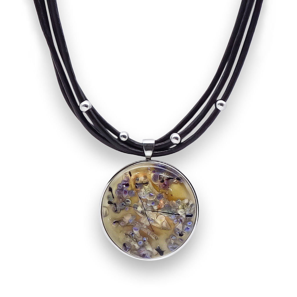 Колье изготовлено из натуральной кожи, муранского стекла и гипоаллергенной ювелирной стали, что очень важно для людей с чувствительной кожей. Металл не темнеет и не подвергается воздействиям окружающей среды, надолго обеспечивая красивый внешний вид изделия. Длина колье - 46 см + 5 см. удлиняющая цепочка. Диаметр стеклянного элемента - 3 см. Вес - 25 гр.­