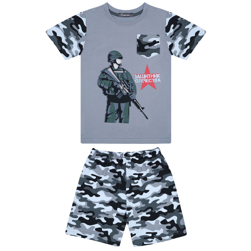 Комплект для мальчика от 6 до 9 лет. Модель состоит из футболки и шорт. Материал ткани хлопковое полотно кулирка ярких цветов с принтом военной тематики. Прекрасный комплект для лета. Состав: 100% Хлопок