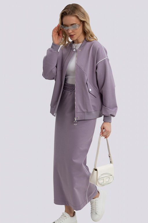 Этот костюм просто взрыв стиля! Идеальный выбор для тех, кто следит за последними трендами и не боится выделяться. Бомбер на молнии, прикрытой стильной планкой, выглядит круто и современно. Карманы, спрятанные в подрезах и украшенные декоративными клапанами, добавляют изюминку. Но главная фишка это контрастный белый кант, эффектно подчеркивающий линию плеч и проймы. Свободный крой, спущенное плечо и трикотажные манжеты на рукавах и по низу бомбера обеспечивают комфорт и расслабленный силуэт. А дальше полная свобода выбора! В комплект можно подобрать юбку или брюки, в зависимости от вашего настроения и предпочтений. Юбка А-силуэта с удобным поясом на резинке и декоративными кантами по бокам это женственно и элегантно. Отсутствие карманов делает силуэт более лаконичным. В этом костюме вы точно будете самой модной и стильной! Состав трикотажа: 75% хлопок, 20% полиэстер, 5% спандекс.