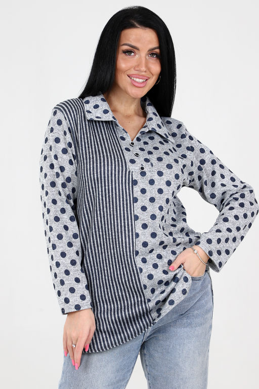 Туника выделяется своим необычным сочетанием узоров: изысканные горохи и полосы создают интересный визуальный эффект, выделяющий вас из толпы. Такая комбинация подходит для создания ярких и запоминающихся образов.
