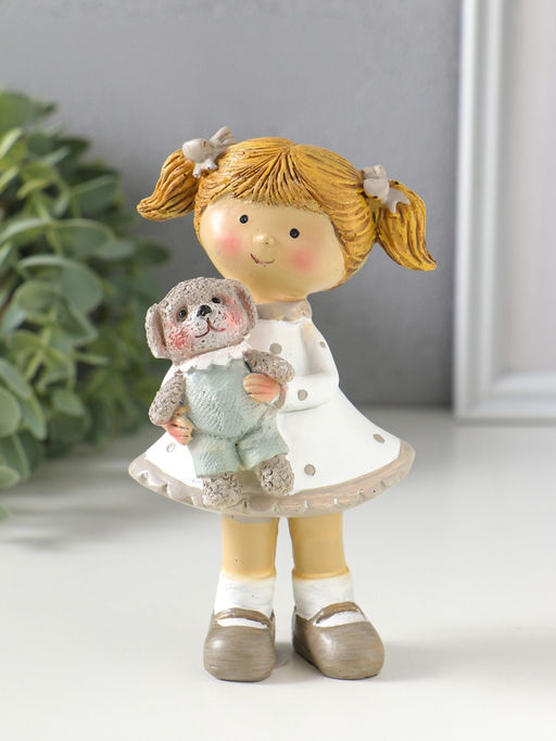 Фигурка полистоун «Девочка с хвостиками в белом платье в горох, с щенком», 8.5×5.5×13 см
