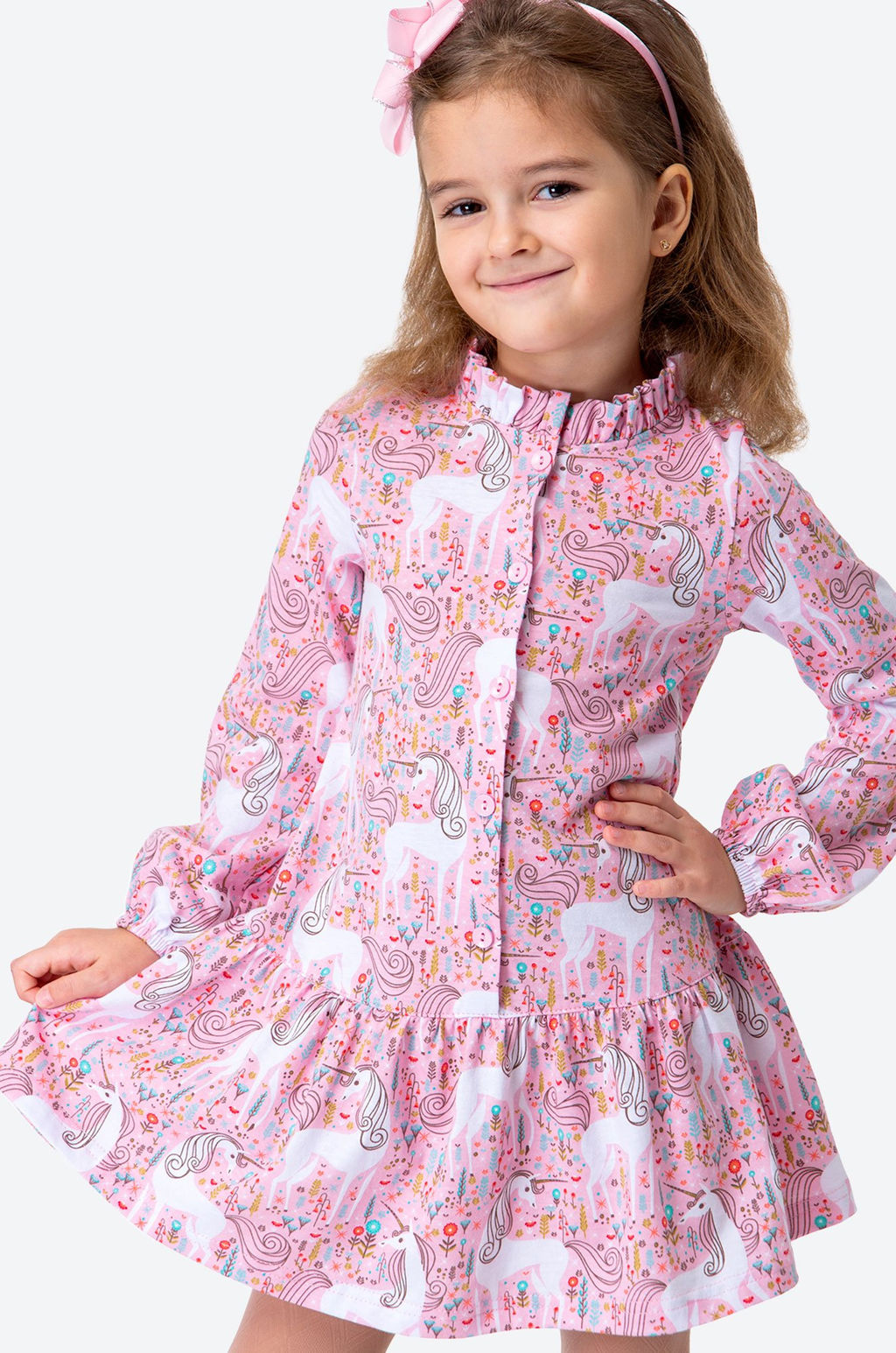 Состав 100% хлопок Детское розовое платье для девочки выполнено из натурального 100% хлопка. Свободный крой, длинный рукав, удобная застежка на пуговицы каждая деталь создана для комфорта ребенка. Благодаря классному принту единороги, кокетливому воротнику-стойке и воздушным сборкам на юбке девочка будет чувствовать себя принцессой в любой ситуации. Нарядное платьице выполнено из легкой трикотажной ткани кулирная гладь, которая делает его идеальным для летней погоды, теплой весны и осени. Платье отлично выдерживает частые стирки и будет радовать ребенка не один сезон. Хлопковое платье для детей не сковывает движений благодаря свободному крою и комфортной длине выше колена. Расклешенная юбка в крупную складку и рукава-фонарики делают образ легким и воздушным, а воротник-стойка добавляет ему сдержанности. Благодаря мягкой резинке длинные рукава не задираются при активных движениях. Короткое платье с рисунком поможет создать стильный образ для повседневных прогулок, детского сада, поездок и праздников. Красивое праздничное платье из трикотажа подойдет для утренников и мероприятий. Оно идеально для лета, теплых осенних и весенних дней. Модель Маша, ее рост 116 см, параметры 57-50-60 см. На ней платье размера 116. Размер 104: длина:54 см; ширина:29 см; длина рукава внешняя:36 см; длина рукава внутренняя:26 см. Размер 110: длина:57 см; ширина:31 см; длина рукава внешняя:38 см; длина рукава внутренняя:27 см. Размер 116: длина:60 см; ширина:32 см; длина рукава внешняя:40 см; длина рукава внутренняя:29 см. Размер 122: длина:63 см; ширина:35 см; длина рукава внешняя:41 см; длина рукава внутренняя:30 см. Размер 128: длина:66 см; ширина:36 см; длина рукава внешняя:44 см; длина рукава внутренняя:32 см. Размер 134: длина:69 см; ширина:38 см; длина рукава внешняя:46 см; длина рукава внутренняя:33 см. *замеры выборочные, могут незначительно отличаться. Страна Россия