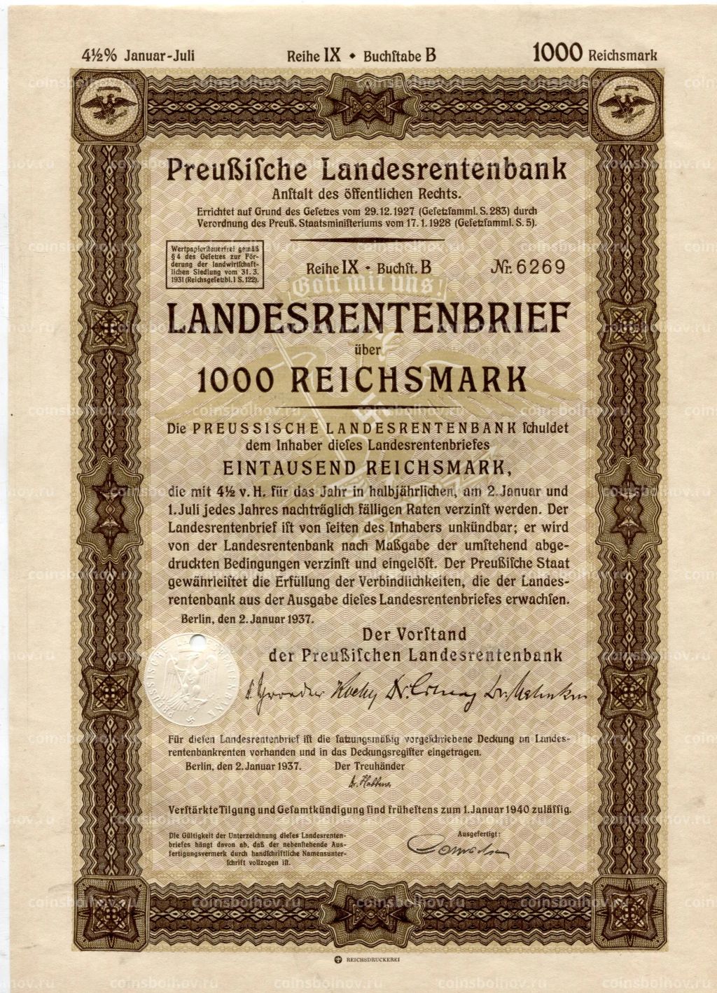 • Облигация 4,5% 1000 рейхсмарок 1937 года Германия