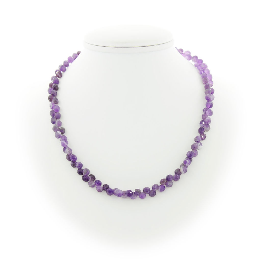 Классическая "бриллиантовая" огранка бусин аметиста в форме капель придаёт им живой блеск и игру оттенков. Бусы собраны индийскими мастерами. Длина бус 47см, размер бусин - около 6мм.