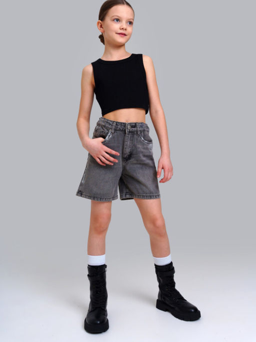 Джинсовые шорты для девочки подростка. Шорты свободного силуэта. Пояс с внутренней утяжкой. Застежка на молнию и болт. Функциональные карманы. Модель выполнена из качественного и плотного текстиля.­