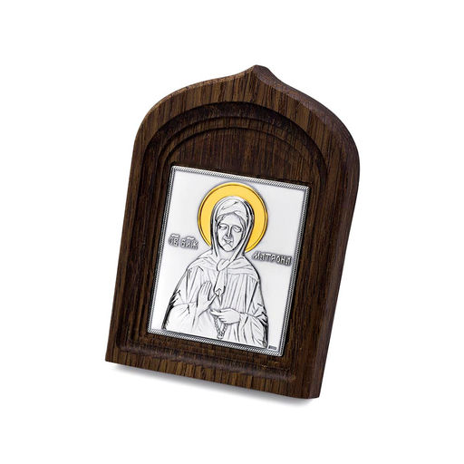 Матрона Московская - самая почитаемая московская святая. Имевшая от рождения дар чудотворения, она стала известна, как молитвенница и подвижница во славу Божью. Вся её жизнь стала примером великого духовного подвига любви, терпения, самоотречения и сострадания. Она видела судьбы людей, исцеляла молитвой болезни. Святая оказывает помощь всем, кто в ней нуждается.Темный  оклад иконы изготовлен из дуба.