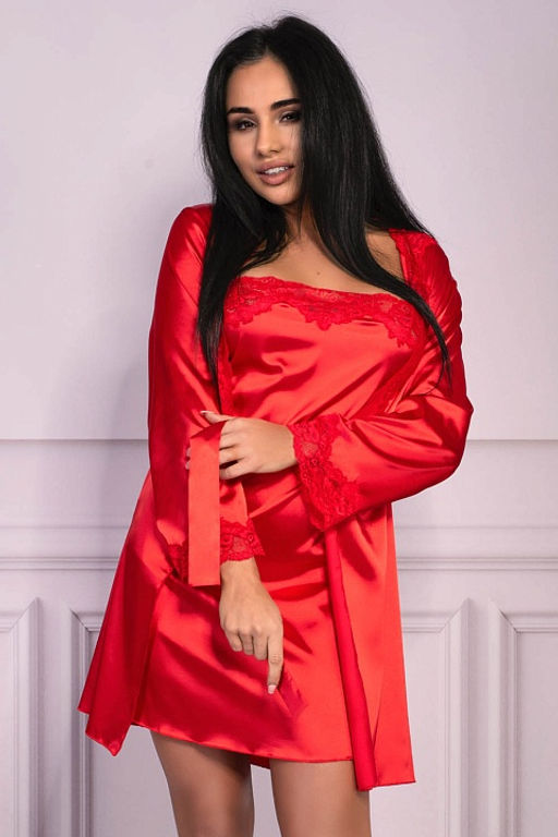Атласный комплект Jacqueline состоит из пеньюара с длинными рукавами, сорочки на тонких регулируемых бретелях и трусиков-стринг. Верх сорочки, рукава и края полочек пеньюара украшены очаровательным кружевом с цветочным узором. Завершает образ съемный пояс из атласной ткани, подчеркивающий красоту фигуры. Комплект упакован в красивую плотную коробочку.­