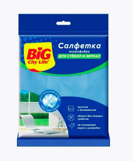 BIG CITY Салфетка из микрофибры для стекол и зеркал 1 шт предназначена для эффективного очищения стеклянных и зеркальных поверхностей. Благодаря своей сверхтонкой структуре волокна микрофибры быстро справляются с любыми типами загрязнений без моющих средств и без разводов. С салфеткой BIG CITY Ваша уборка будет максимально быстрой и результативной. Плотность 220 г/м2