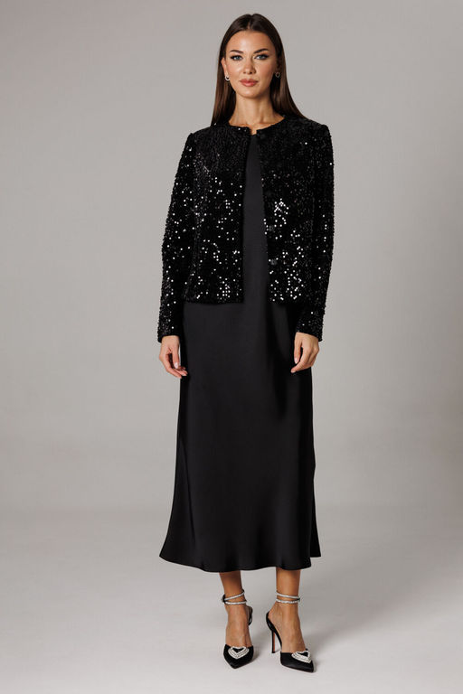 Состав: Жакет: Вискоза-20%; ПЭ-77%; Спандекс-3%; Платье: Вискоза-30%; ПЭ-68%; Эластан-2%; Жакет полуоблегающего силуэта с притачными рельефными бочками на спинке полочке из эффектной ткани с пайетками. Застежка фронтально вертикальная на скрытую кнопочную систему. Рукав втачной двухшовный. Длина жакета по спинке 54- 55 см, длина рукава 61-62 см. Горловина округлой формы. Платье комплекта А-силуэта, без рукавов. Крой выполнен по косой, что придает изделию струящийся шарм. Горловина округлой формы. Линии проймы и горловины обработаны укороченным обтачным чехлом из основной ткани. Длина изделия 124-127 см (в зависимости от размерного ряда). Представленная фурнитура может отличаться от представленной на фото/видео материале. Особые рекомендации: рекомендуется холодная деликатная ручная стирка, без использования отбеливающих СМС, без интенсивного трения. Сушка в вертикальном положении. ВТО с минимальным паром. -- Характеристики -- Состав: Жакет- Вискоза-20%; ПЭ-77%; Спандекс-3%; Платье- Вискоза-30%; ПЭ-68%; Эластан-2%; Сезон: Осень-Зима Рост: 164 Страна бренда: Беларусь