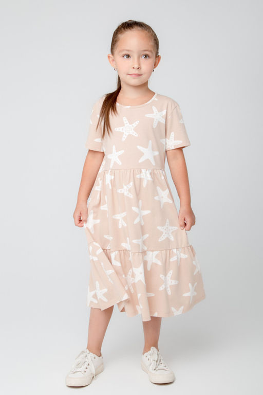 Легкое трикотажное платье для девочки из высококачественного хлопка. Оригинальная набивка выполнена из стойких текстильных гипоаллергенных красителей. Изделие сохраняет цвет и форму после многократных стирок.­