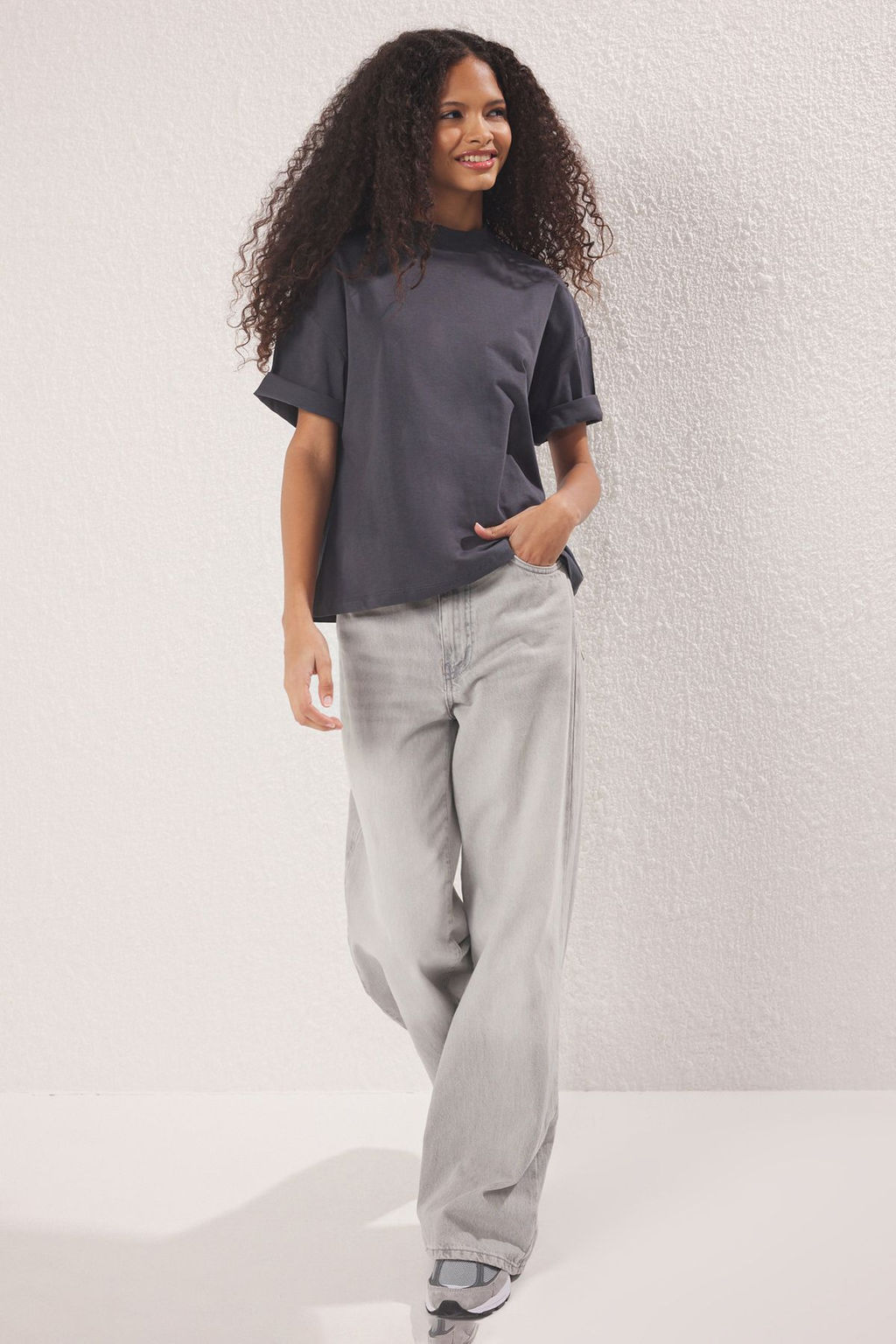 Antrasit %100 Kal?n Pamuklu Dik Yaka Truvakar Kol Orme T-Shirt TWOSS24TS00074