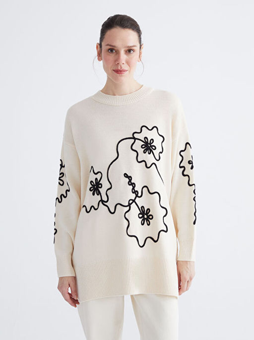Bisiklet Yaka ?i?ek Nak??l? Kad?n Triko Kazak