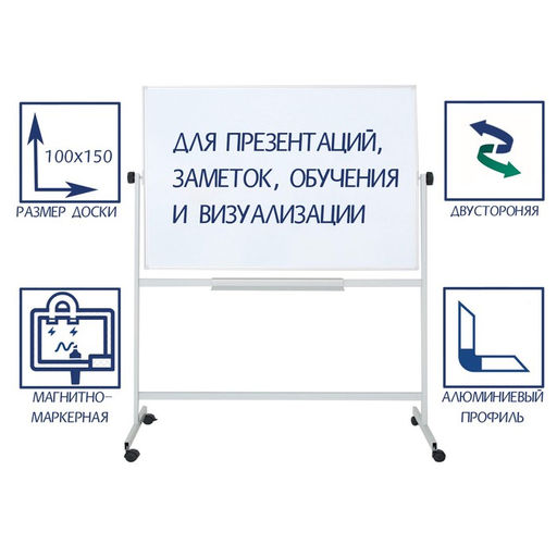 Магнитно-маркерная доска серии ЭКОНОМ на мобильной подставке с двумя рабочими поверхностями позволяет сделать подачу информации более эффективной. Идеально подходит для совещаний, планирования задач и любого мозгового штурма. Доски такого вида успешно используются в учебных заведениях, офисах и любых коммерческих помещениях.Доска имеет лаковое покрытие, предназначенное для письма специальными маркерами для белой доски.Металлическая составляющая покрытия делает доску магнитной.Алюминиевая рама обеспечивает надежность и прочность при работе с доской.Элементы крепления и полка для принадлежностей входят в комплект.Размер - 100х150 см. Формат: А0+. Ширина, см: 150. Высота, см: 100. Поворотная: Да. Вид доски: Магнитно-маркерная. Особенности: На колесиках. Вид установки: Напольный. Линовка доски: Без линовки. Серия: ЭКОНОМ. Наша разработка: Да.