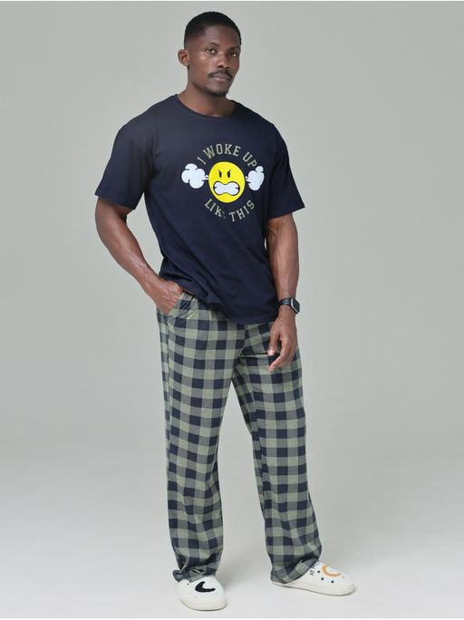 Удобный домашний костюм со штанами для мужчин из 100% хлопка или пижама для дома и сна - носите так как вам нравится. Комплект футболка с оригинальным принтом и пижамные домашние штаны в клетку с карманами.­