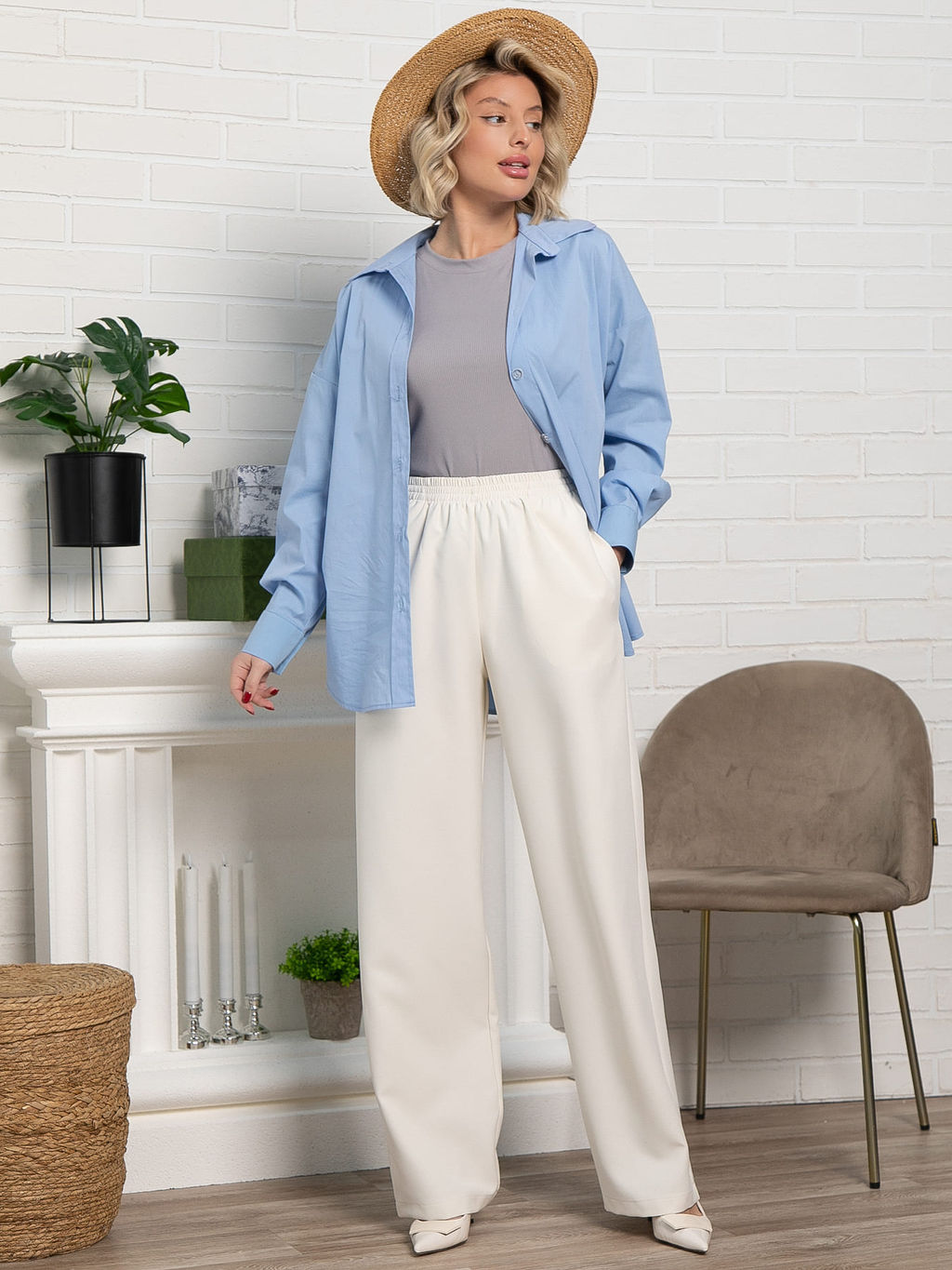 Состав : 95% полиэстер, 5% спандекс Материал : костюмный Цвет : молочный Принт : отсутствует Карманы : есть Резинка в поясе : да Вид застежки : без застежки Тип посадки брюк : высокая Пояс брюк : притачной Крой брюк : прямой Фасон брюк : классические Декоративные элементы : отсутствуют Обхват бёдер : 44 - 96, 46 - 100, 48 - 104, 50 - 108, 52 - 112 Длина готового изделия по внутреннему шву : 44-80 см, 46-79.5 см, 48-79 см, 50-79 см, 52-78 см Длина готового изделия по боковому шву : 44-111 см, 46-111.3 см, 48-111.5 см, 50-111.7 см, 52-112.7 см Отснято с рубашкой Б15225-53М Элегантные женские брюки в молочном цвете идеальный выбор для любого случая. Они отлично впишутся как в деловой костюм, так и в повседневные образы. Прямой крой модели выгодно подчеркивает фигуру и создает свободу движений. Пояс с резинкой обеспечивает комфортную посадку по талии. Эти брюки прекрасно сочетаются с блузками, рубашками, пиджаками и топами, что позволяет создавать разнообразные стильные образы каждый день. Внимание! Рекомендуем ориентироваться на размерную сетку и выбирать свой привычный размер, согласно размерной таблице. *Допуск отклонения длины при массовом производстве 1-3 см является нормой. Уход за изделием: Ручная стирка или стирка в машине при температуре до 30 C, деликатный режим. Не использовать отбеливатели. Разрешена глажка при температуре до 110 C. При глажке использовать специальную насадку на подошве утюга, гладить с паром. Не замачивать и не выжимать. Стирать изделие наизнанку, отдельно от других вещей. -- Характеристики -- Цвет: молочный