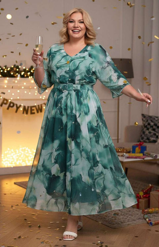 Элегантное платье из мягкого материала - подчеркнет вашу женственность и изящность. Модель без подплечников, имеет свободные цельнокроеные рукава длиной ? с небольшими разрезами по низу. Полуприлегающий верх идет с женственным V-образным вырезом. Платье отрезное по линии талии. Вытачки на груди и по спинке обеспечивают оптимальную посадку по фигуре. Линия талии подчеркнута с помощью ремня в тон. Свободная юбка создает женственный силуэт и искусно обыгрывает бедра. Фатиновый верх платья с оригинальным принтом добавляет модели воздушности и лёгкости. Яркий клатч и туфли на каблуках станут идеальным дополнением к нарядному образу.­