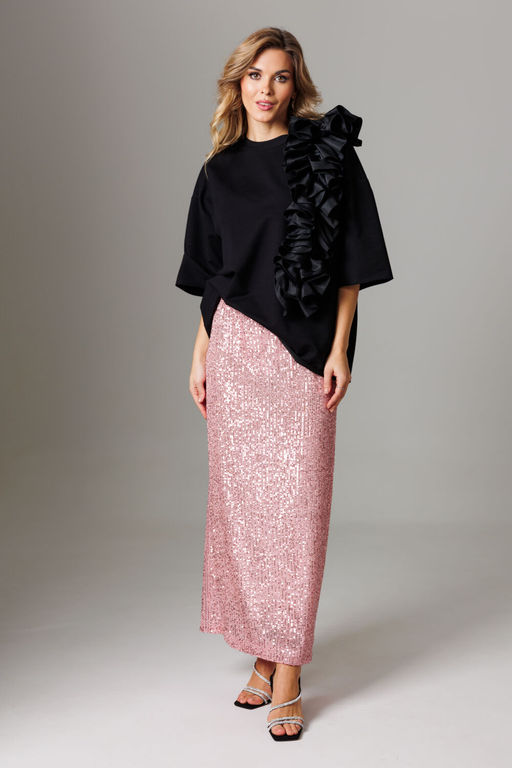Состав: Блуза: Хлопок-95%; Эластан-5%; Юбка: ПЭ-97%; Спандекс-3%; Элегантный комплект, состоящий из майки стиля oversize с объемным ассиметричным воланом и длинной юбки (юбка на трикотажной подкладке) с мерцанием и разрезом в среднем шве. Блузон свободного силуэта, со спущенной линией проймы и укороченным втачным рукавом, длиной 26 см. Акцентной деталью изделия является обьемный волан со сборкой по центру детали. Волан со сборкой расположен вертикально и со смещением относительно центра блузона. Горловина округлая, оформлена планкой 2,8 см. Длина блузона по спинке 62-65 см (в зависимости от размерного ряда). Юбка комплекта удлиненная, со средним швом, в котором располагается открытый разрез, высотой 38 см. Юбка на трикотажной подкладке. Линия талии оформлена притачным поясом с эластичной тесьмой внутри. Высота пояса 4,5 см. Длина изделия по среднему шву 95 см. Представленная фурнитура может отличаться от представленной на фото/видео материале. Особые рекомендации: рекомендуется холодная деликатная ручная стирка, без использования отбеливающих СМС, без интенсивного трения. Сушка в вертикальном положении. ВТО с минимальным паром. -- Характеристики -- Состав: Блуза- Хлопок-95%; Эластан-5%; Юбка- ПЭ-97%; Спандекс-3%; Сезон: Осень-Зима Рост: 164 Страна бренда: Беларусь