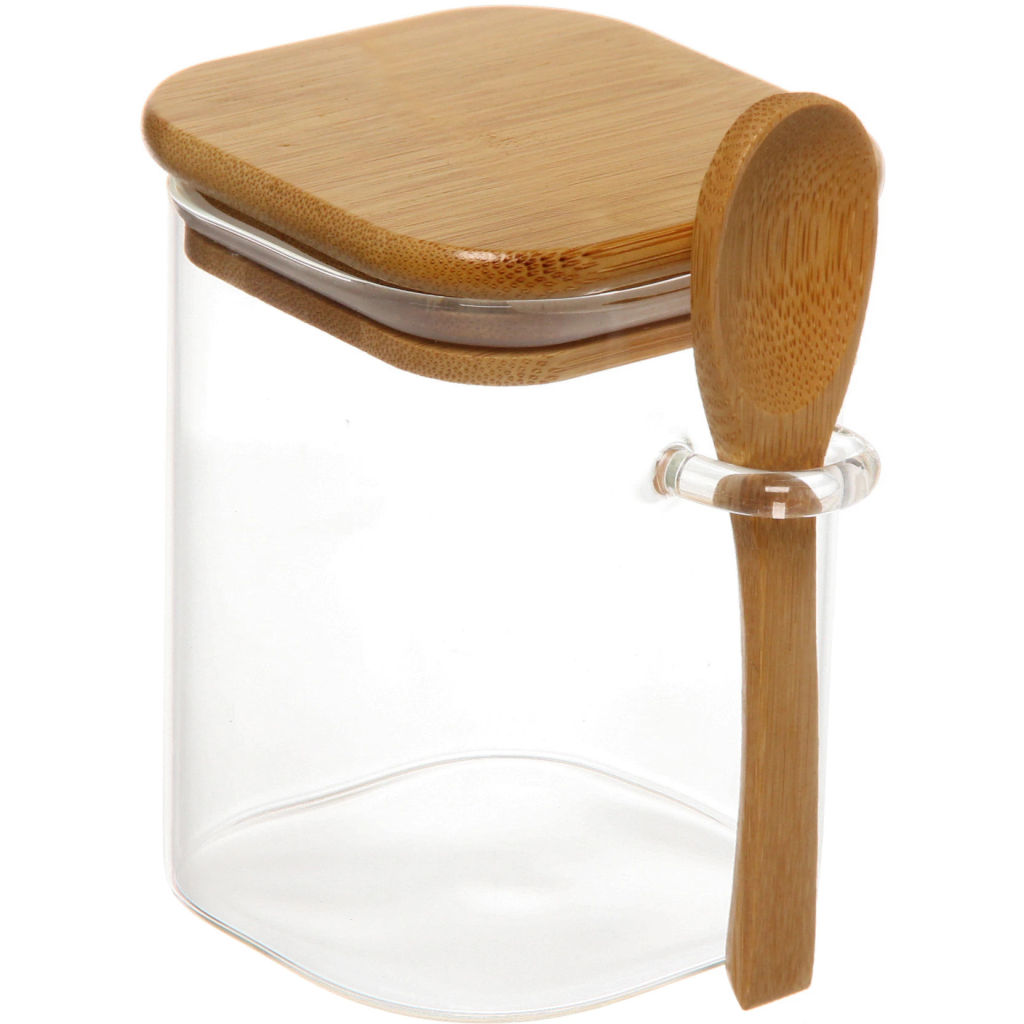 • Банка для продуктов стеклянная 450мл "Хай-Тек" с бамбуковой крышкой и ложкой, квадратная 8*10см