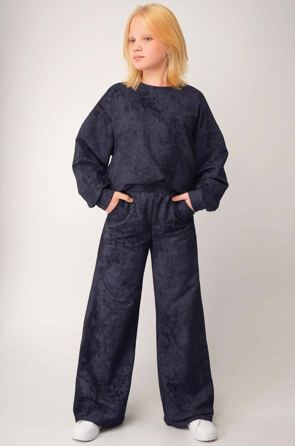 Состав: 74% хлопок, 21% полиэстер, 5% лайкра Футер двухнитка 240 г/м2. Страна: Россия. Детский костюм для девочки и девочки подростка с вареным эффектом стиль без усилий. Глубокий тон и свободный силуэт создают выразительный повседневный образ, а плотный футер даёт ощущение уюта в прохладную погоду. Преимущества: футер двухнитка (240 г/м2) плотный и мягкий; хлопок с добавлением полиэстера износостойкость + комфорт; удлинённая толстовка оверсайз со спущенным плечом визуально вытягивает силуэт; брюки палаццо дарят максимальный комфорт и свободу движений; ткань с эффектом варёнки стильная текстура; костюм подходит для демисезонной погоды. Трикотажный костюм двойка подойдёт девочкам и подросткам для активных будней, прогулок или встреч с друзьями. Хлопковый костюм с широкими штанами отличный выбор в спортивном и кэжуал стилях. Модель Настя, ее рост 152, параметры: 61-55-67. На ней размер 152. Размер 134: джемпер: длина:55 см; ширина:51 см; длина рукава внешняя: 39 см; длина рукава внутренняя: 37 см; брюки: длина внеш.шва:85 см; длина внутр.шва:61 см; ширина по бедрам:39 см. Размер 140: джемпер: длина:57 см; ширина:53 см; длина рукава внешняя: 41 см; длина рукава внутренняя: 39 см; брюки: длина внеш.шва:89 см; длина внутр.шва:64 см; ширина по бедрам:40 см. Размер 146: джемпер: длина:60 см; ширина:55 см; длина рукава внешняя: 43 см; длина рукава внутренняя: 40 см; брюки: длина внеш.шва:93 см; длина внутр.шва:67 см; ширина по бедрам:41 см. Размер 152: джемпер: длина:63 см; ширина:56 см; длина рукава внешняя: 45 см; длина рукава внутренняя: 42 см; брюки: длина внеш.шва:97 см; длина внутр.шва:70 см; ширина по бедрам:43 см. Размер 158: джемпер: длина:66 см; ширина:57 см; длина рукава внешняя: 47 см; длина рукава внутренняя: 44 см; брюки: длина внеш.шва:100 см; длина внутр.шва:72 см; ширина по бедрам:45 см. Размер 164: джемпер: длина:69 см; ширина:59 см; длина рукава внешняя: 49 см; длина рукава внутренняя: 46 см; брюки: длина внеш.шва:104 см; длина внутр.шва:75 см; ширина по бедрам:47 см. *замеры выборочные, могут незначительно отличаться.