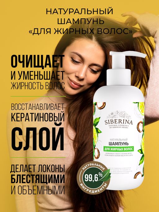 Натуральный шампунь обеспечивает комплексный уход за жирными волосами и кожей головы: нормализует работу сальных желез, придает волосам ухоженный и свежий вид на весь день.