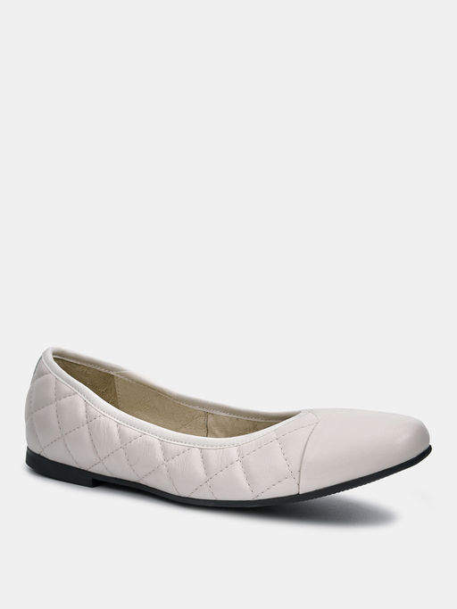 Балетки женские MOLLY молочного цвета. Натуральная кожа верха, подкладки и стельки позволяет ногам дышать и поддерживает правильный микроклимат в обуви. Стеганый узор и гладкий отрезной носок делают модель стильной и актуальной. Светлая подкладка не будет окрашивать стопы. Тонкая подошва из ТЭП с небольшим каблуком смотрится изящно, при этом она гибкая и прочная. Текстильный кант по краю делает посадку максимально комфортной, он не давит и не натирает. Бежевые балетки дополнят классические деловые и более женственные образы с платьями и костюмами, их также можно носить в casual образах с джинсами и кардиганом.