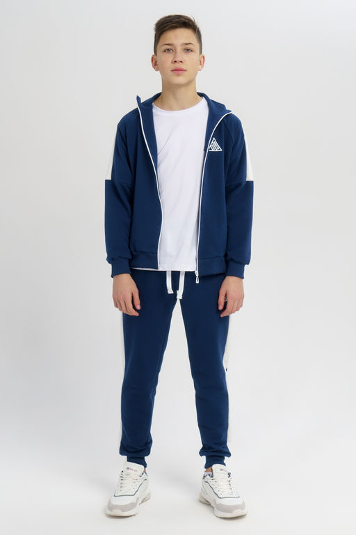 Костюм двойка из футера 2-х нитки качество пенье. Состоит из олимпийки с карманами и манжетами на рукавах и брюк без карманов. Крой свободный. Олимпийка и спортивные брюки декорированы контрастными лампасами по низу изделия манжеты. Олимпийку дополняет принт.