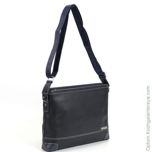 Мужская сумка из натуральной кожи темно-синего цвета. Закрывается на металлическую молнию. Внутри одно отделение, боковой карман для ноутбука на липучке, два открытых боковых кармашка и карман на молнии. Снаружи, на задней стенке карман на молнии. Сумка имеет не съемный, текстильный регулируемый ремень.