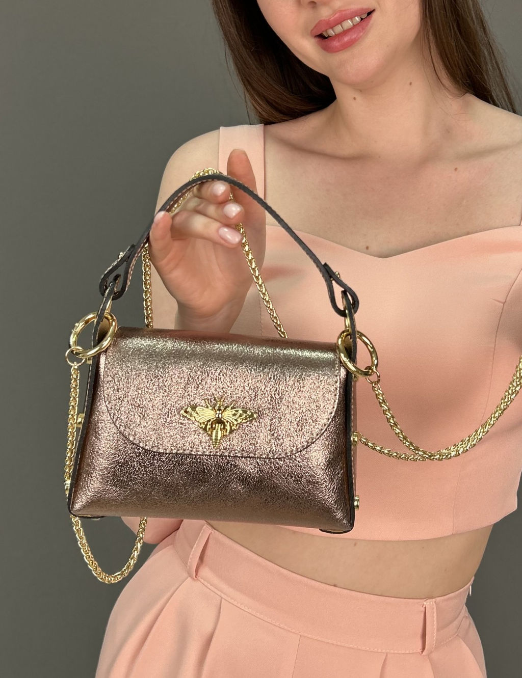 Страна: Италия Производитель: Pelletteria Luisa, Italy Размер: маленькая Стиль ношения: на ремешке через плечо Форма: жесткая Выделка кожи: зернистая износостойкая Цвет кожи: Золотой Оттенок: платиновый металлик Палитра цветов: TB-101028 Размеры: длина: 18 см \tвысота: 12 см \tширина: 6 см \tвысота ручки: 9 см \t Описание: Красивая аккуратная необыкновенно модная женская сумка из натуральной кожи. Базовая коллекция Sefaro, Италия. Главные особенности модели: кросс-боди, замок в виде золотой бабочки, съемный плечевой ремень-цепочка, а также заклепки на боковых стенках сумки - используется фурнитура высокого итальянского качества в золотом цвете. Все эти элементы непременно привлекут к вам внимание окружающих своей яркостью и оригинальностью исполнения. Сумочка имеет каркасную форму, компактная, выполнена из зернистой телячьей кожи надежной и прочной в носке, может использоваться как повседневная модель, но подойдет и для торжественного случая - элегантно дополнит вечерний образ по типу клатча, либо подчеркнет сдержанный деловой, классический или даже винтажный стиль. Закрывается сумка внахлест на элегантную застежку с пряжкой, внутри один отдел, в котором поместится только самое необходимое. На дне сумки металлические защитные ножки. Можно носить в руке, на запястье, либо на изящной цепочке через плечо (длина 120см) - очень удобно!